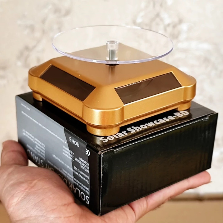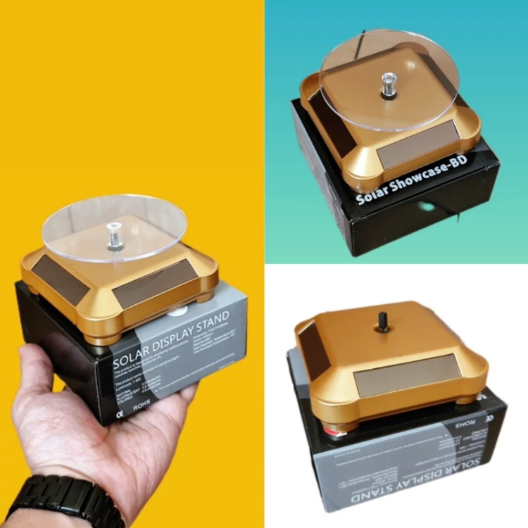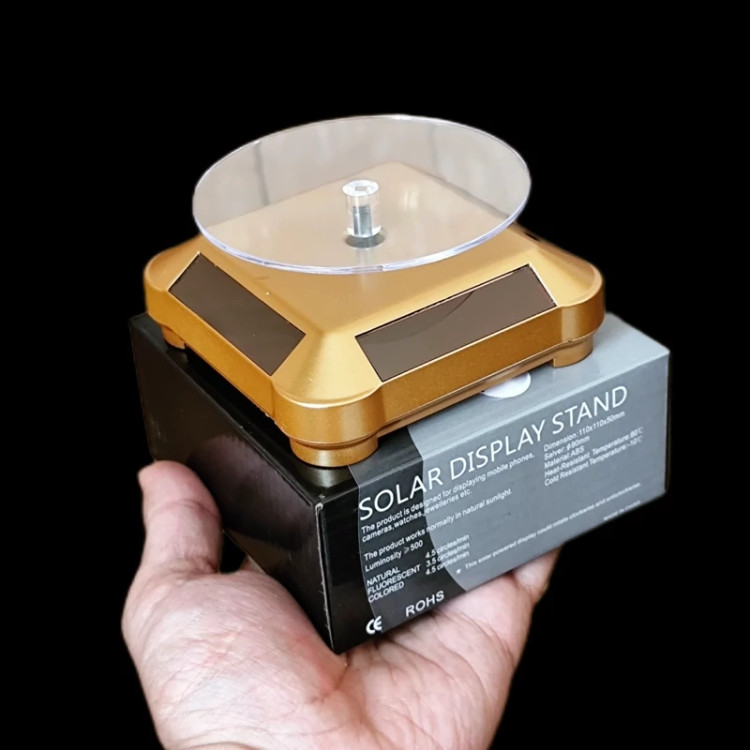 استند گردان نوری ویترینی با نور خورشید و نور ویترین و باطری عمل می کند چهارطرفه استند نوری المان های خورشیدی قراره داره تا نور محیط رو دریافت کنه تا گردان شروع به چرخش کند مناسب برای جواهرات ،ساعت و سایر اکسسوری ها 😊