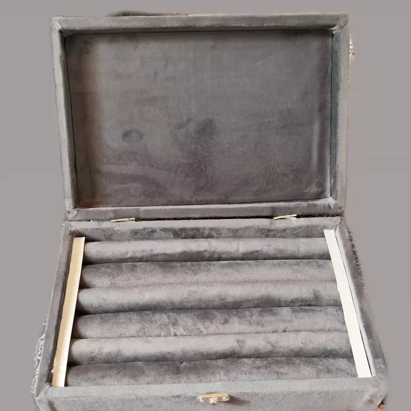 سینی انگشتری و النگویی درب دار رنگ طوسی شارژ شد✨♥ ➖➖➖➖➖➖➖➖➖ 🎀🎀مشخصات 🎀🎀 ✔️✔️ قابل سایز بندی ✔️✔️ 20ارتفاع✔ 29عرض✔ 🎀🎀رنگ بندی🎀🎀 طوسی تیره🩶 جنس تمام مخمل مناسب برای دستبند های النگویی و انگشتری یک کار درب داره و قفل دار با کیفیت درجه یک برای مغازه داران محترم 😊 ➖➖➖➖➖➖➖➖