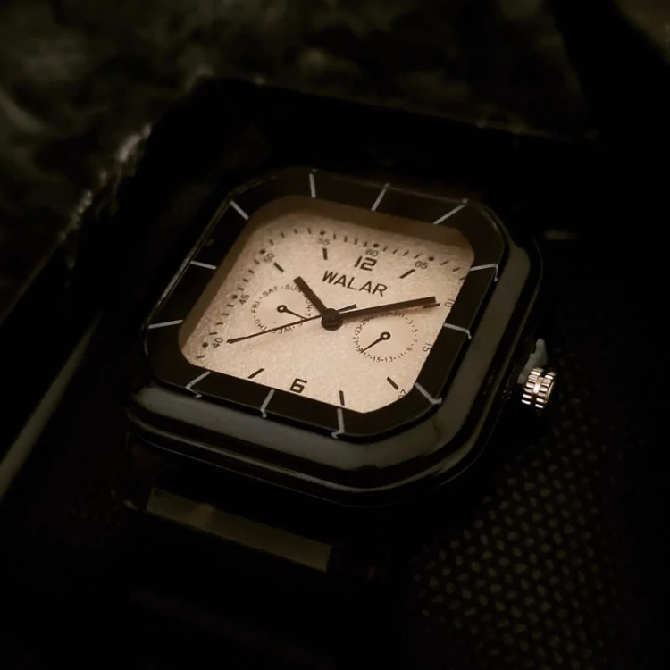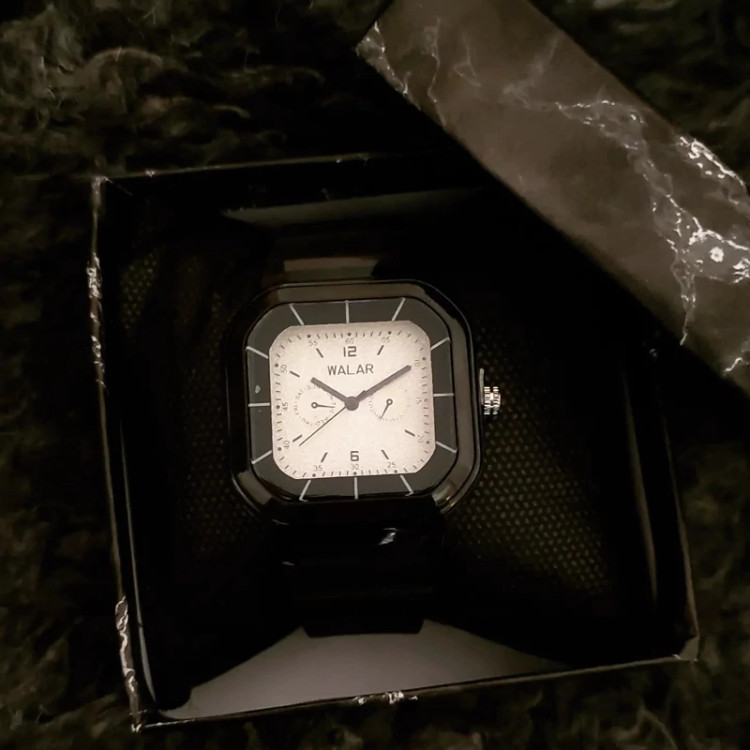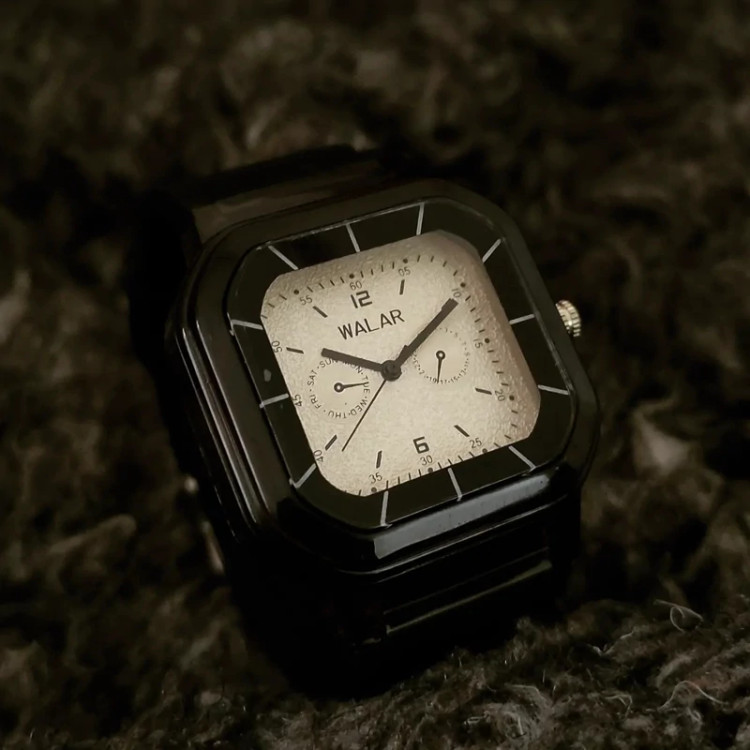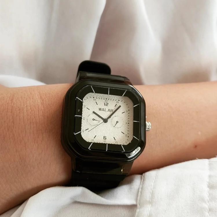 رنگ داخل پس زمینه ساعت مایل به کرم و بندها کاملا مشکی ✅